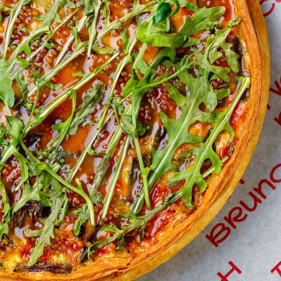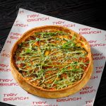 Состав: фирменное тесто, сливки, яйцо, тунец консервированный, крем-чиз, томат, стручковая фасоль, руккола, медово-горчичный соус.